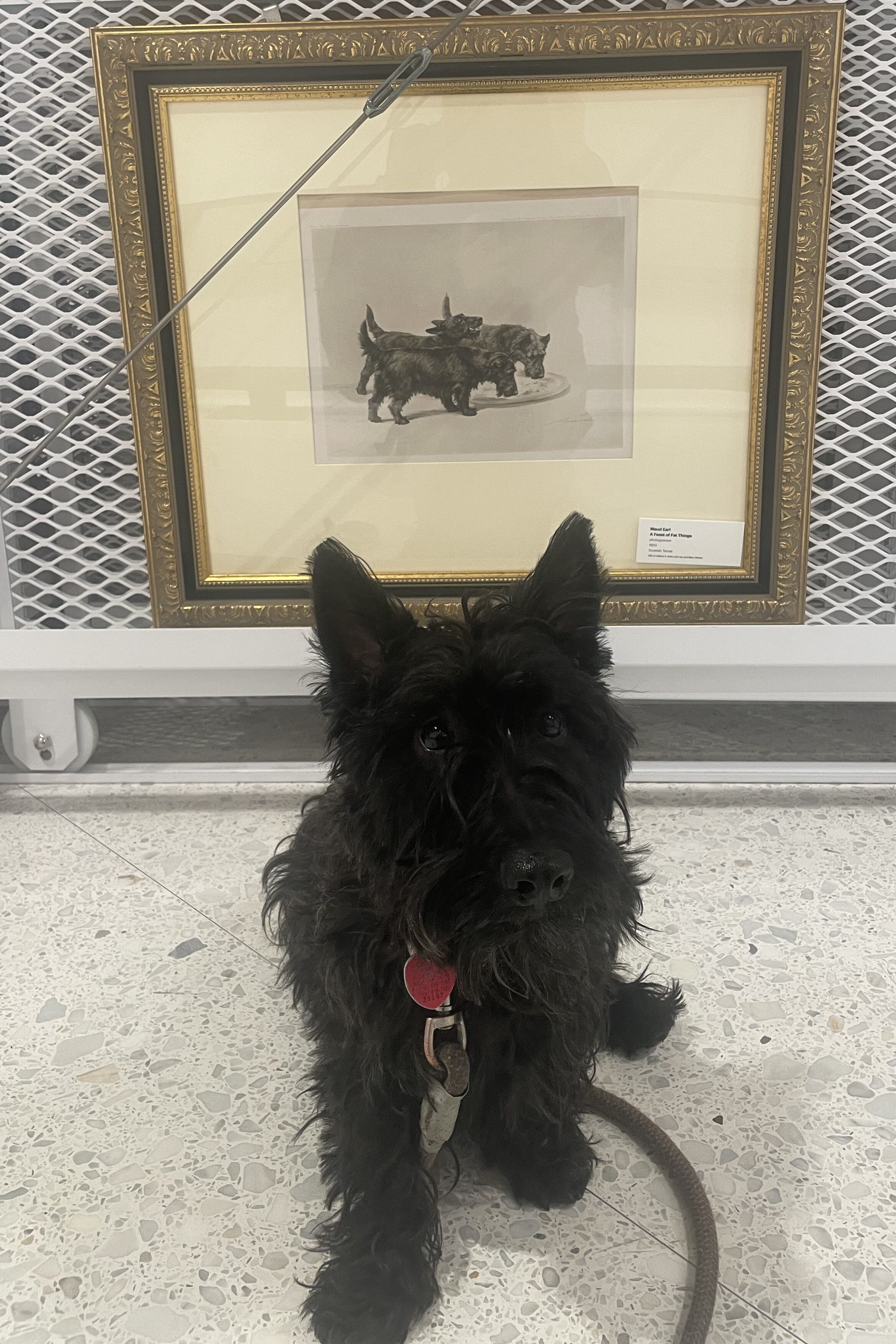 Bonnie enjoyed sniffing some life-size dog statues, before we moved on to the floors above where there was more artwork—along with interactive games for the humans. I was thrilled to find at Bonnie’s height a pen-and-ink drawing entitled “A Feast of Fat Things” depicting three of her fellow Scotties tucking into a dish. I was more taken with the picture than she was, but she still gamely posed for a photo in exchange for a treat.