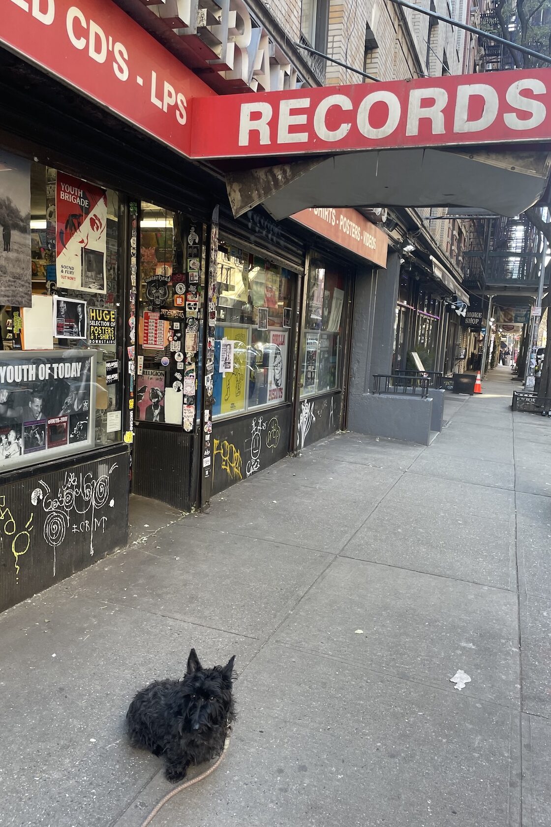 10:35am, Greenwich Village: Generation Records was not on my original list, but we walked by it and dipped in. I asked if dogs were welcome and the woman manning the cash register asked if she could give Bonnie a treat, presenting a large bag of dog treats almost immediately. I declined on Bonnie’s behalf because she’d had many treats that day and would be getting more later, but we both appreciated the hearty welcome.