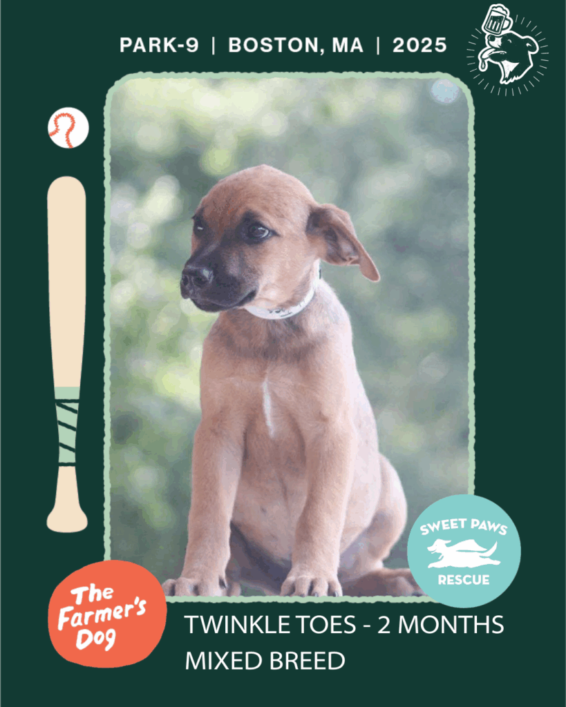At the “Puppies in the Outfield” event, the adoptable dogs ran, leapt, and chased, and one all-star named Fresca found her forever home. Her new family will enjoy a free first box of The Farmer’s Dog food, and $350 toward future orders. Plus, suggested donations to enter Park-9 and all proceeds from concessions benefited SPR, a New England–based rescue.