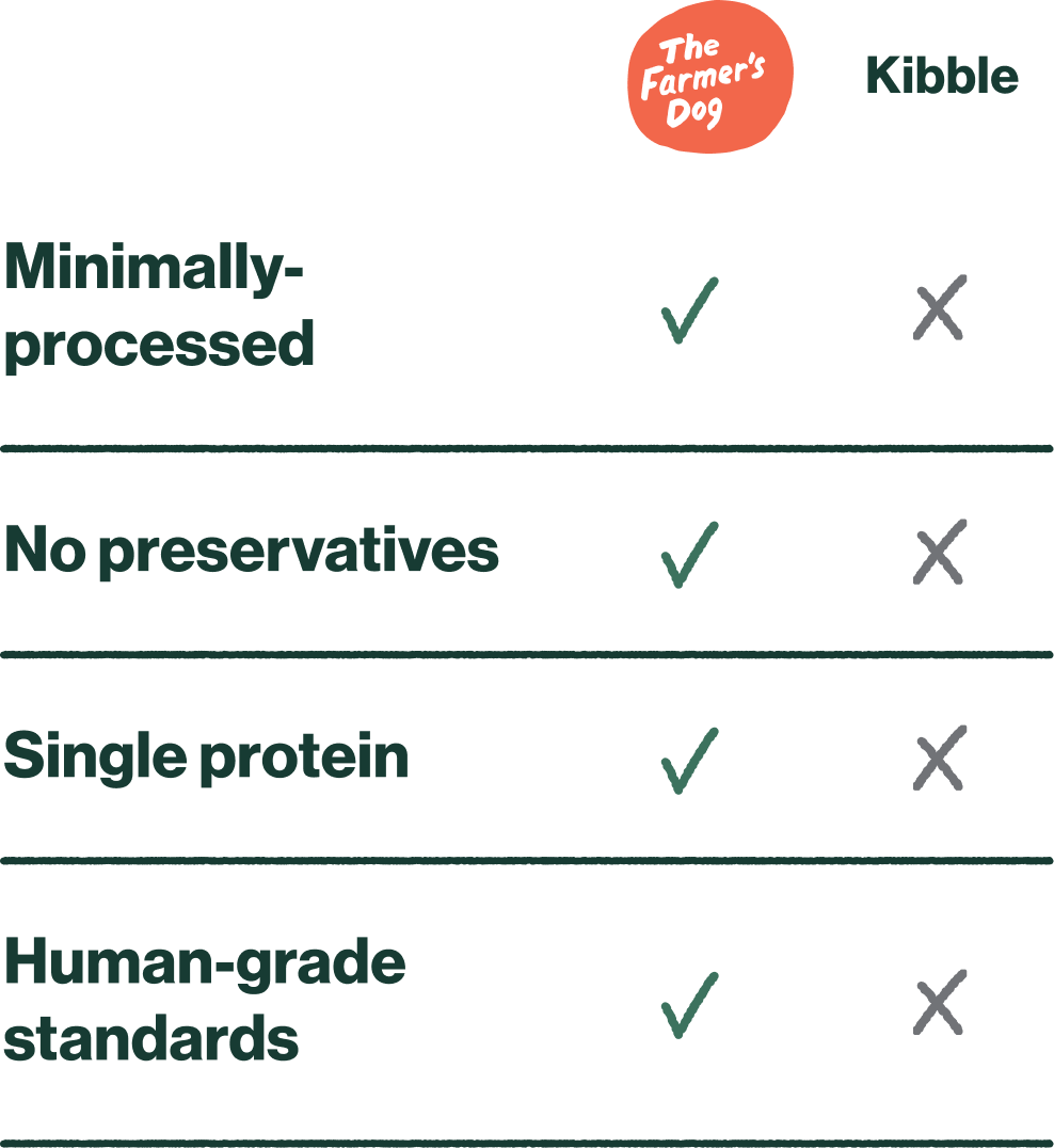 If you look at a bowlful of our fresh food versus a bowlful of kibble, the difference is glaring. One is filled with dozens of burnt brown balls, while the other contains whole meats and veggies that you can actually see. That’s because kibble is ultra-processed, resulting in dry pellets.